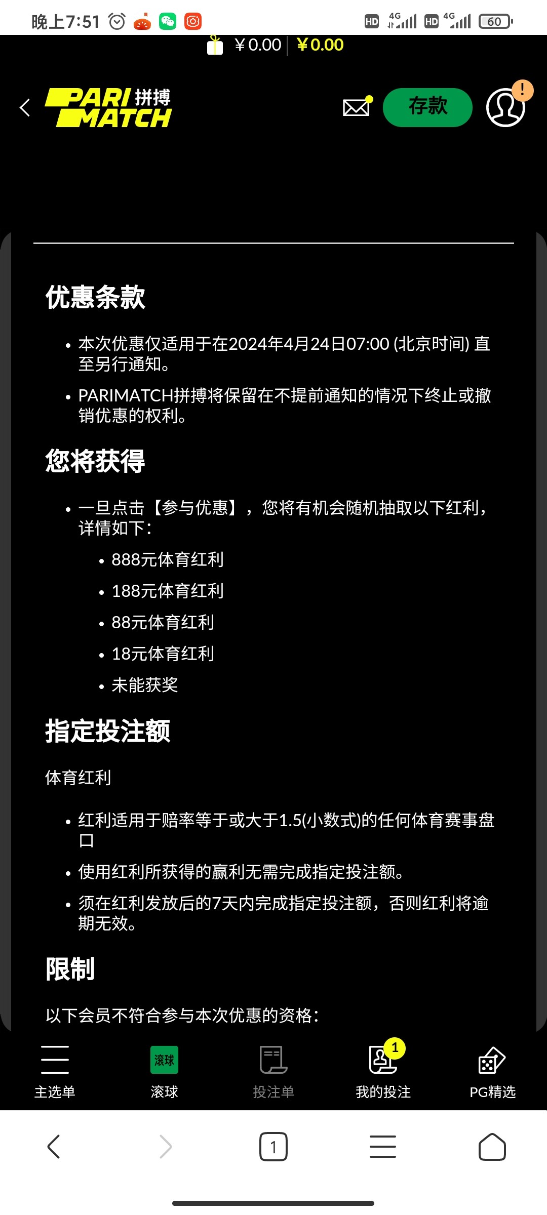点头像然后返回,看到主页显示红利余额了再去下注,输完金额点一下红利投注那里就可以了