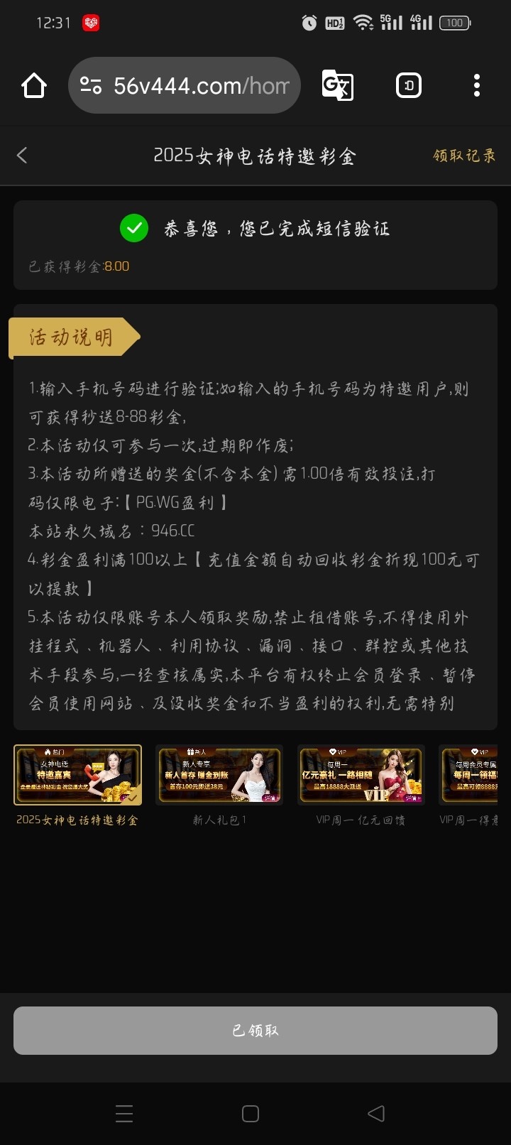 电话特邀你们自己碰一下吧我领到了8,有号的好像也有神秘彩金自己去看一下
