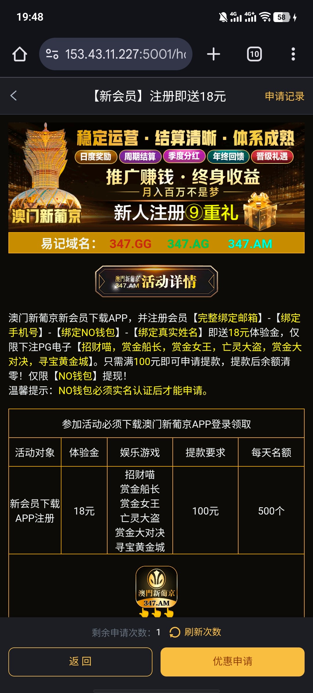 澳门新葡京新会员下载APP,并注册会员[完整绑定邮箱 - [绑定手机号] -[绑定NO钱包] - [绑定真实姓名]即送18元体验金,仅限下注PG电子[招财喵,赏金船长,赏金女王,亡灵大盗,赏金大对决,寻宝黄金城]。只需满100元即可申请提款,提款后余额清零!仅限(NO钱包]提现! 温馨提示:NO钱包必须实名认证后才能申请。