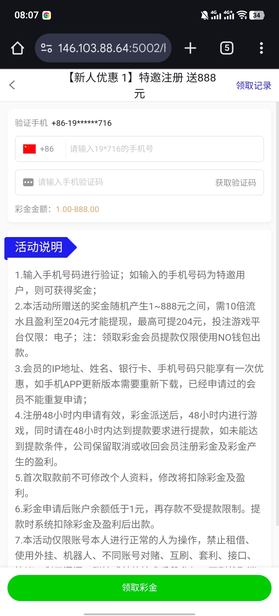 注册账号填入手机号码 自助申请彩金