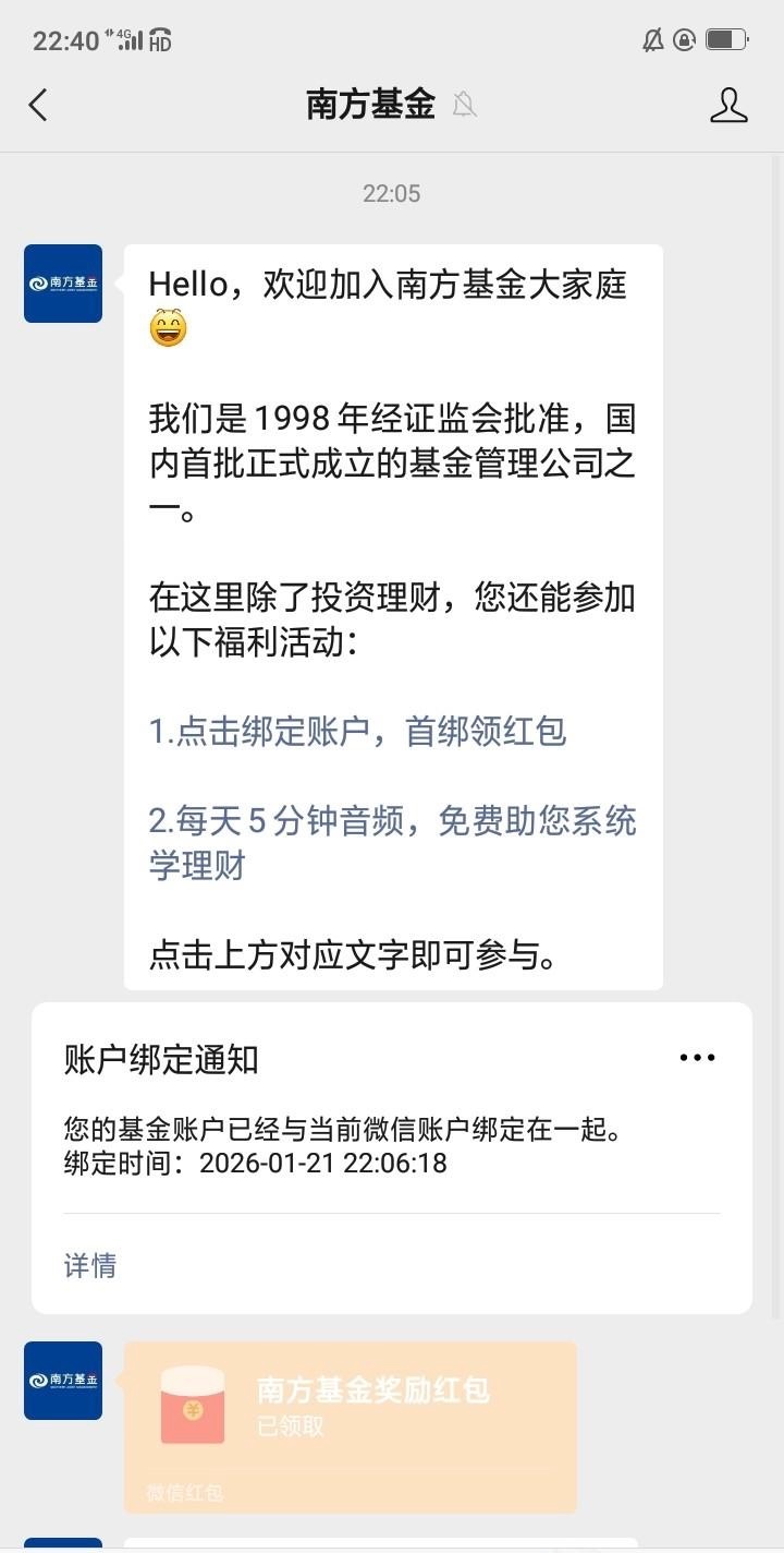 微信搜索南方基金公众号关注,点击绑定账户,首绑领红包,人脸登录,人人4元,没有基金账户也可以绑定