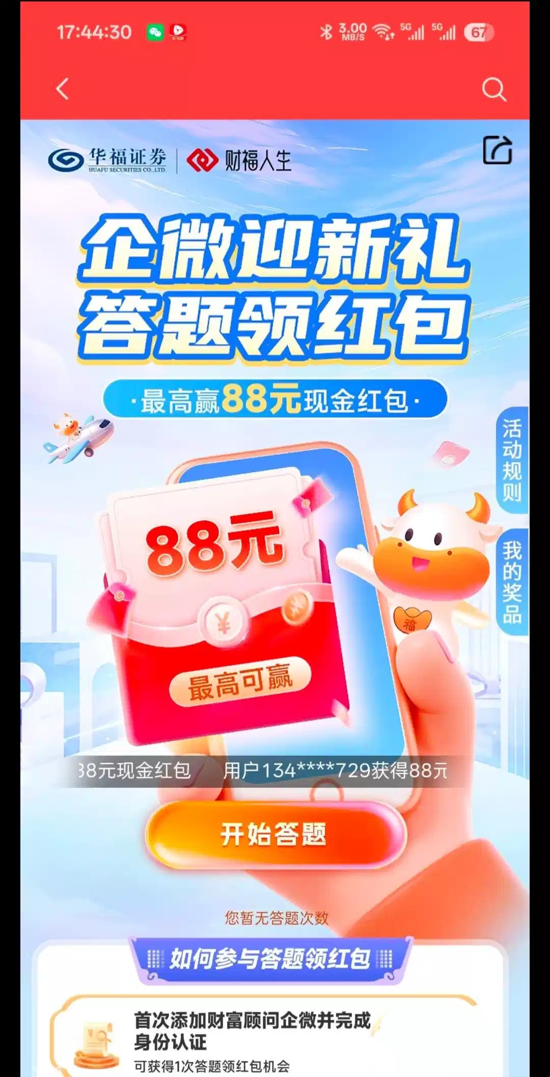 【华福证券答题6.8红包】