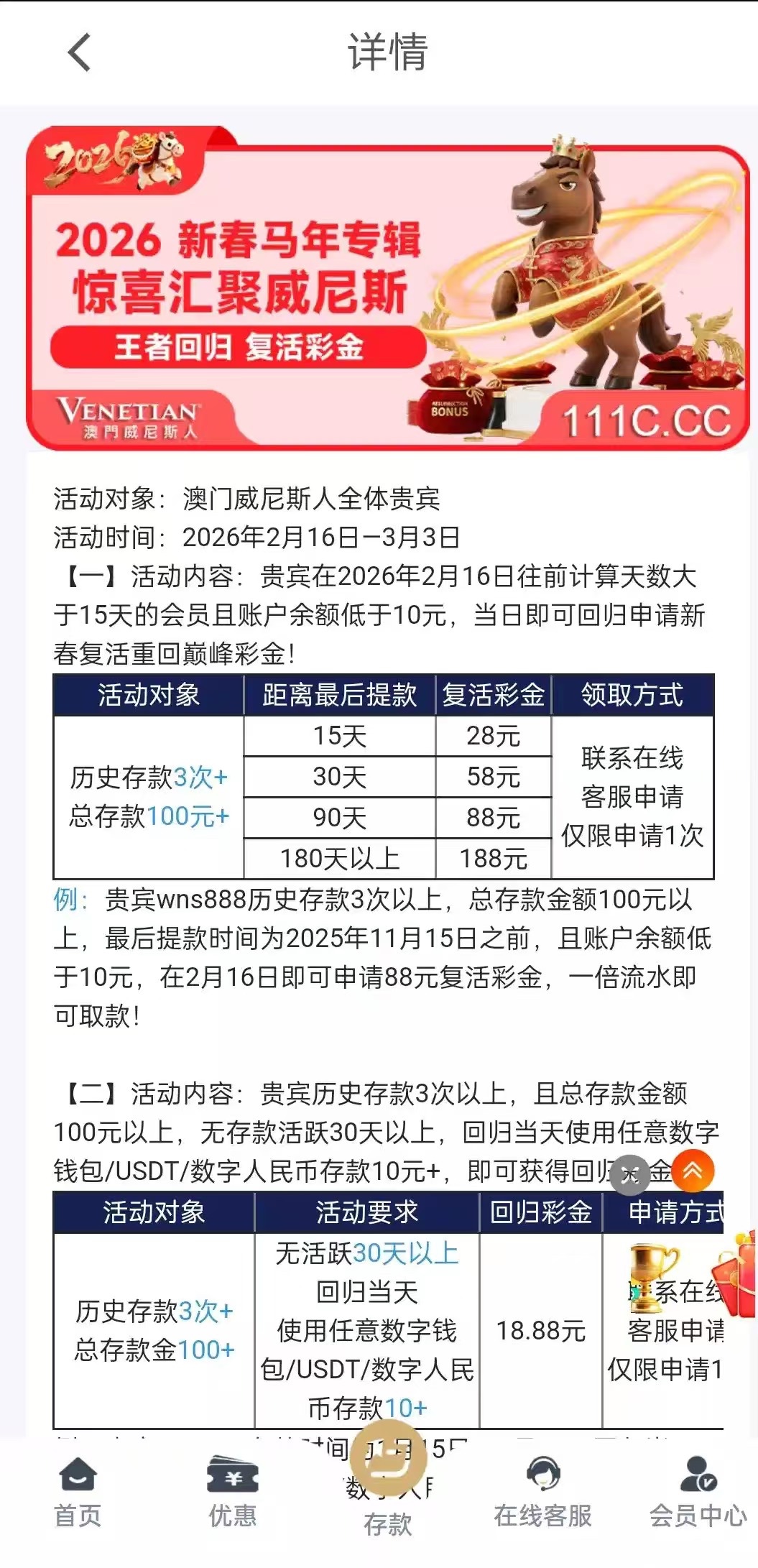 威尼斯回归180天未登录可以领188, 提了200,已到,勿充值白嫖即可链接111c.cc