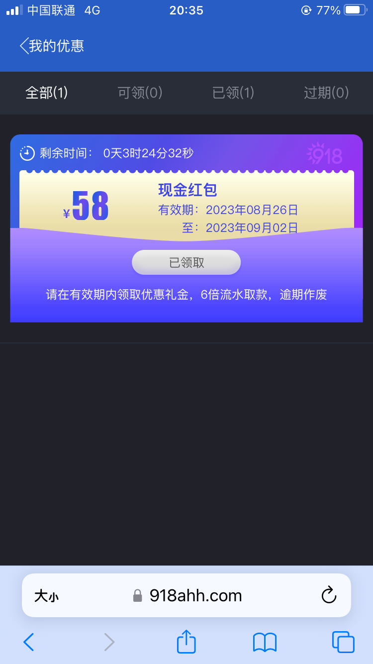 接到电话说有58彩金没领取让上号领取,领到了