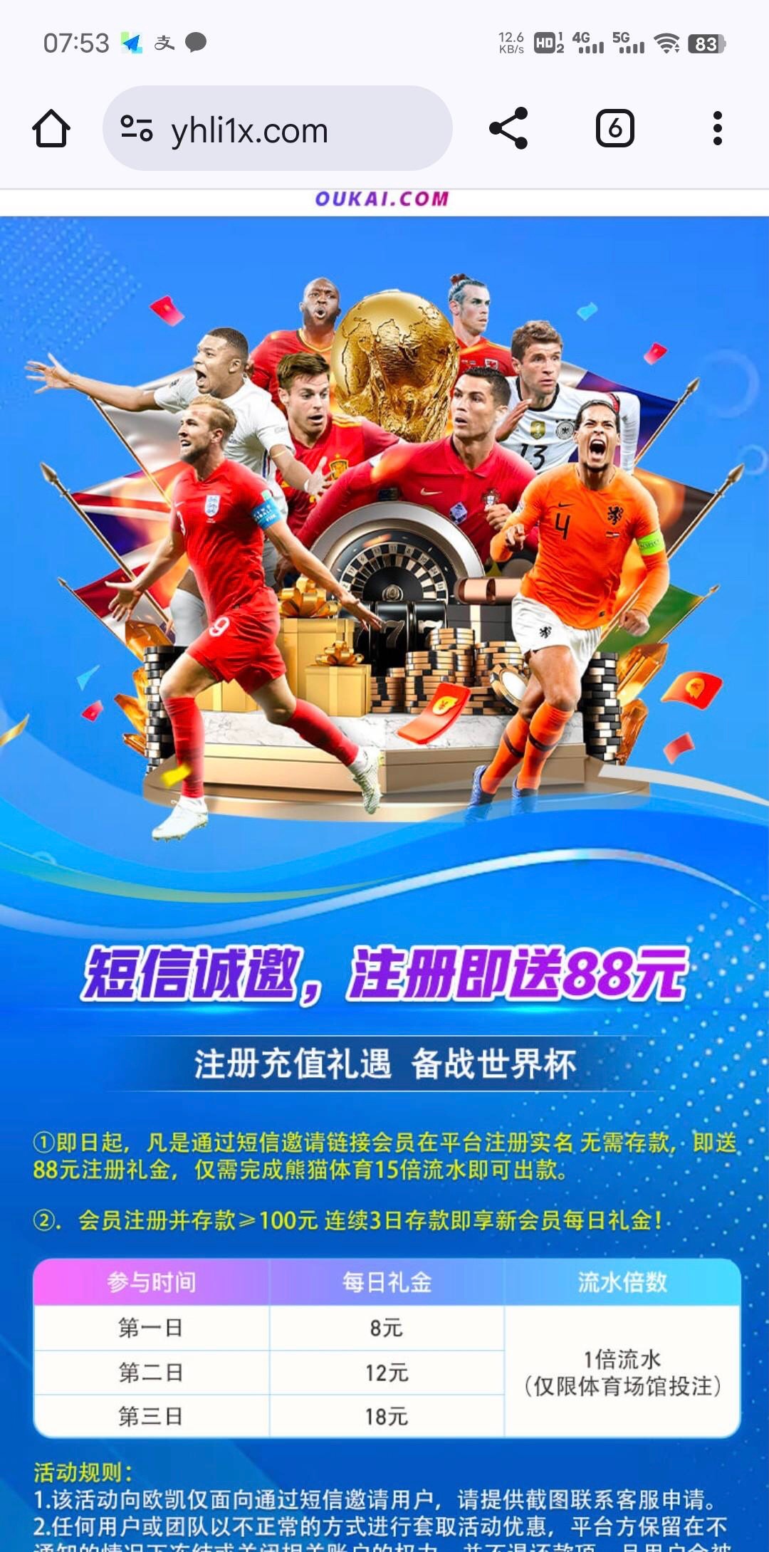 注册送88  注册找客服说领取特邀彩金,88只能打熊猫体育15倍流水,我出了500,开始还以为是黑台,结果提现秒到,应该不需要特邀,我朋友没收到短信注册也送了,必须走短信里面的链接注册才送 http://titoxs.com