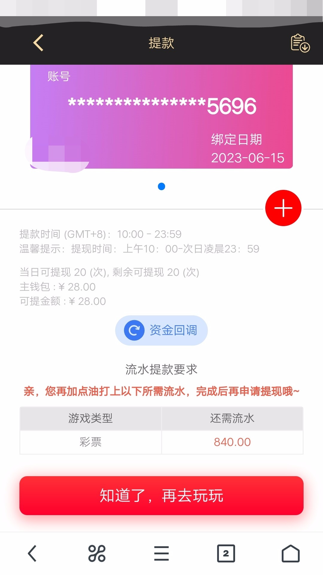 提不了吗  我打到2000了  提现显示彩票840流水