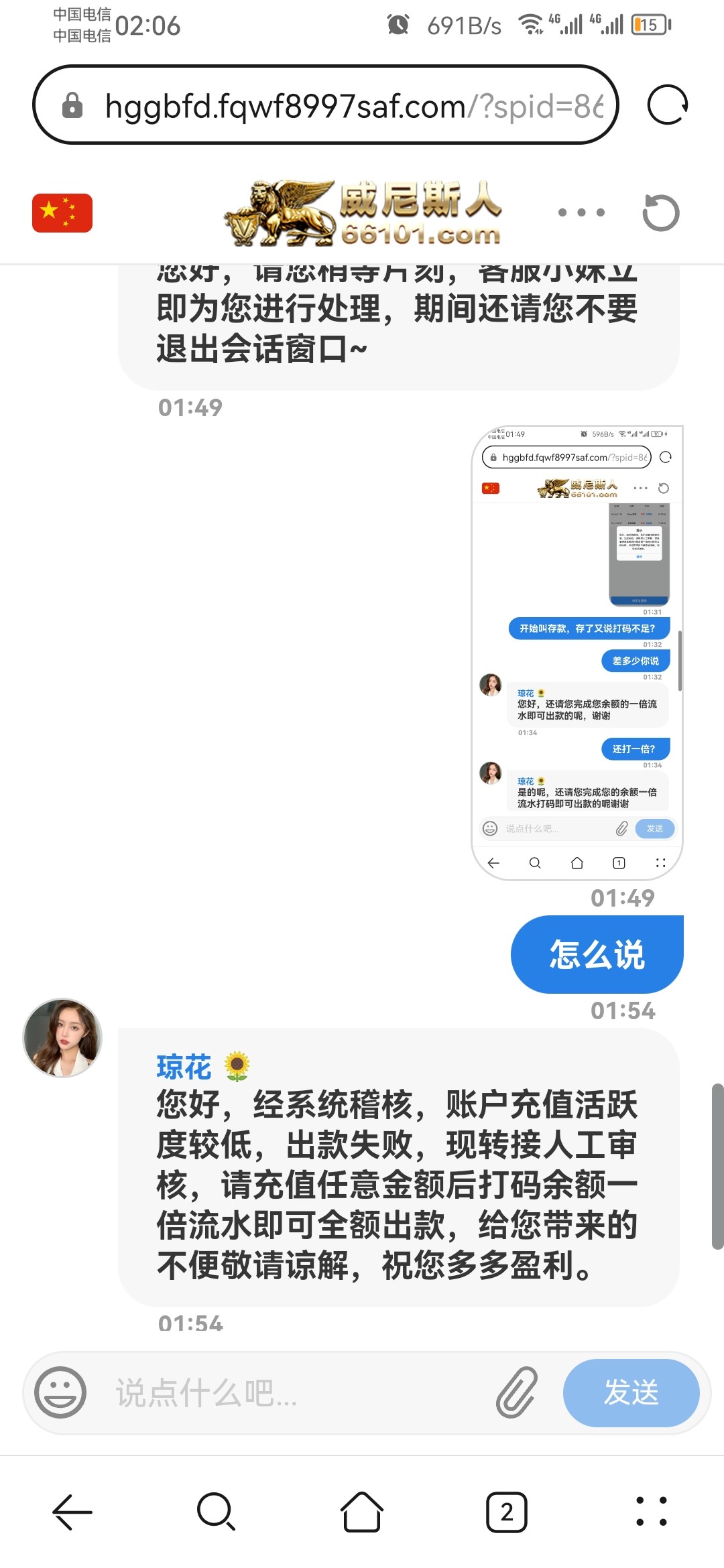 取款开始说活跃度低需要充值任意金额打一倍流水,充值50打流水后取款又叫我打一倍流水,流水打够后取款又来活跃度低又要存款任意金额打流水他妈的50快钱给老子玩俄罗斯套娃